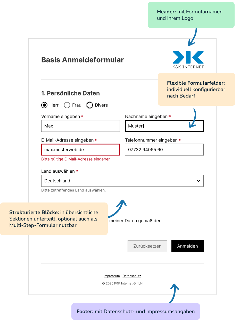 Sofort startklar: Fertig eingerichtetes Online-Formular – direkt nutzbar.